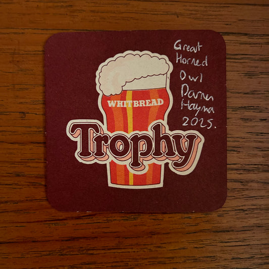 A Great Horned Owl painted onto a drink/drive Trophy beer mat from the 1970s. Beermat painting. Watercolour.