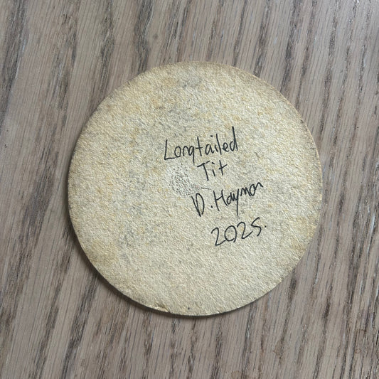 A Longtailed Tit painted onto an XL potato crisps drinks mat from the 1950s. Beermat painting. Watercolour.
