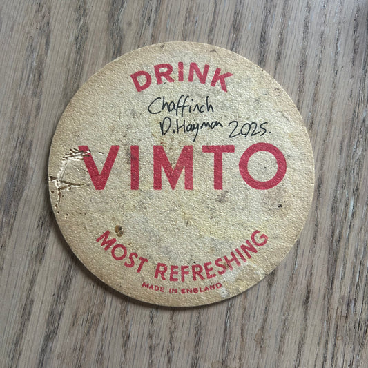 A Chaffinch painted onto a Vimto drinks mat from the 1950s. Beermat painting. Watercolour.