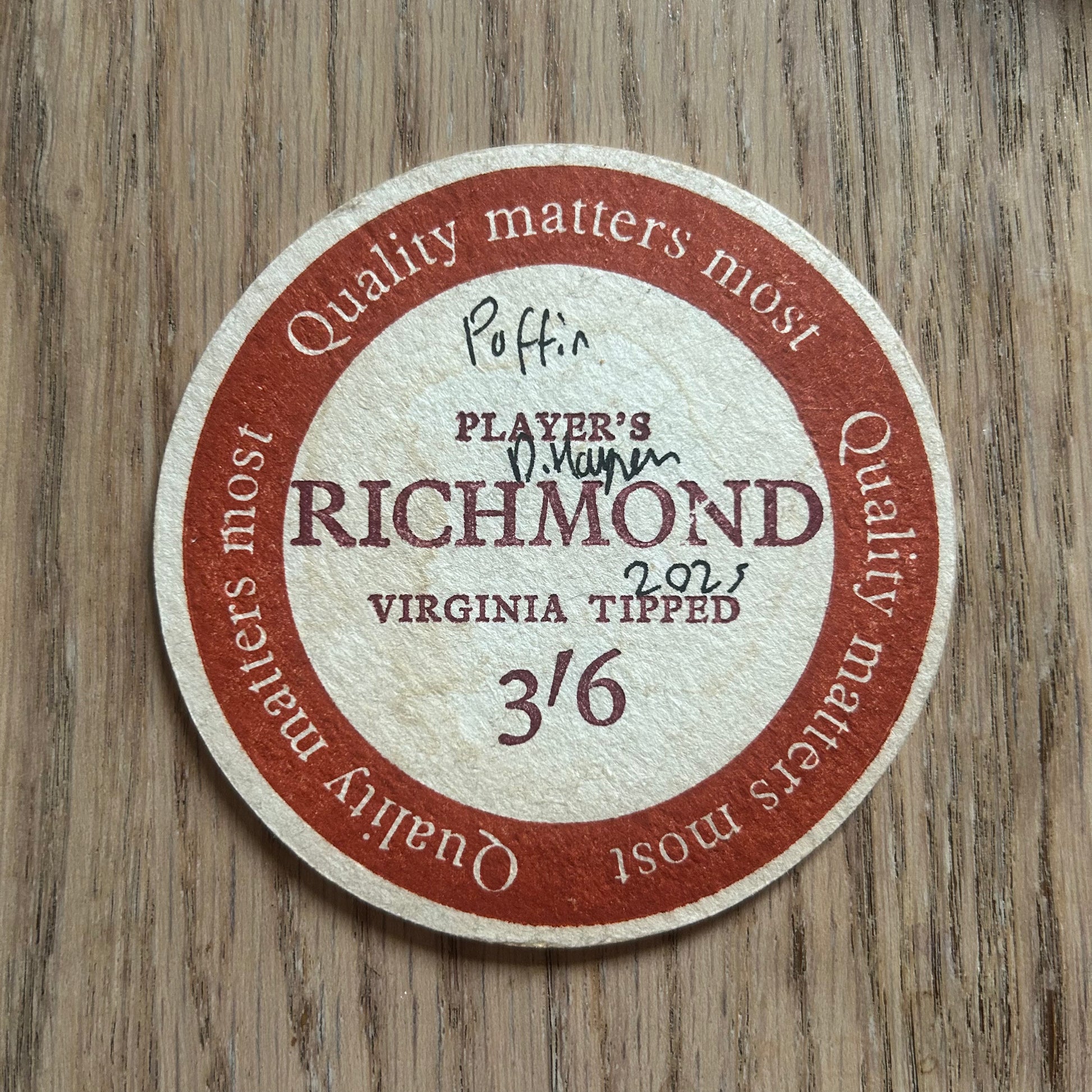 A Puffin painted onto a Players Richmond cigarettes drinks mat from the 1950s. Beermat painting. Watercolour.