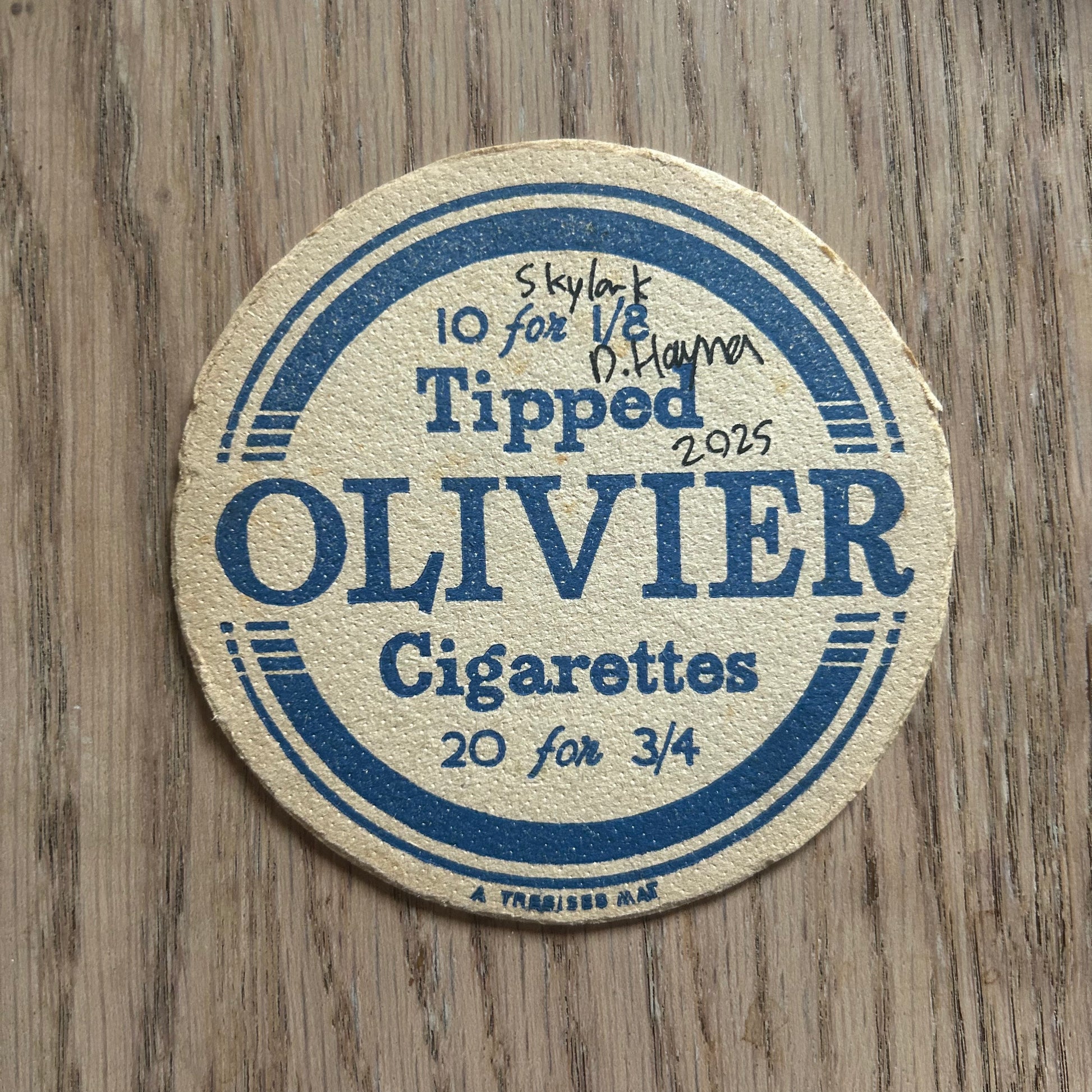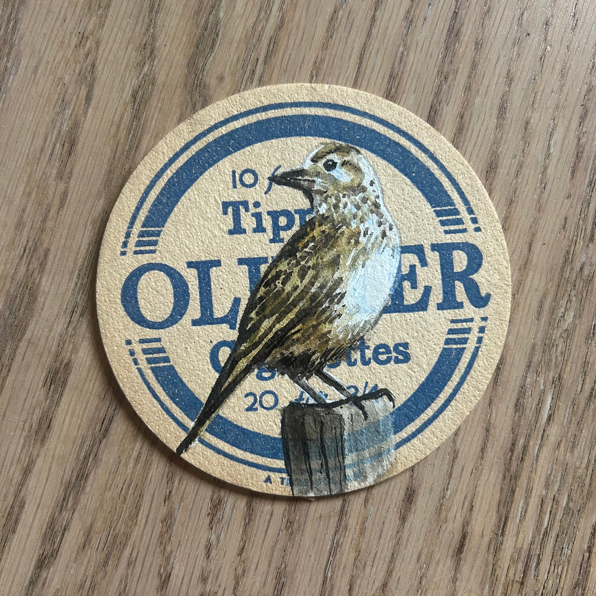 A Skylark painted onto an Oliver’s cigarettes drinks mat from the 1950s. Beermat painting. Watercolour.