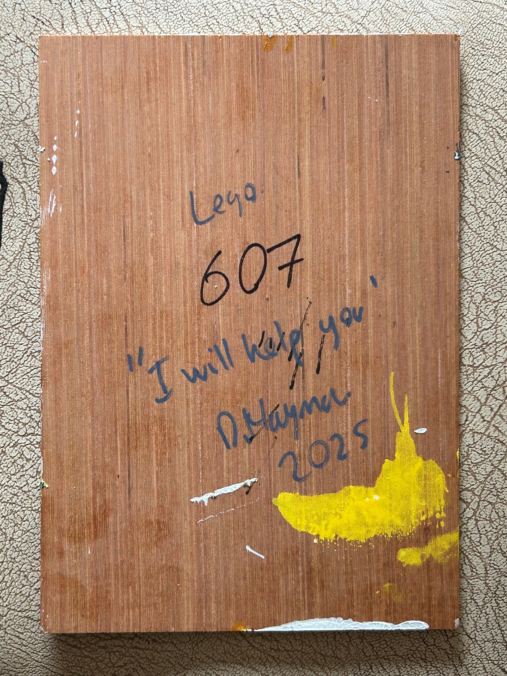 ‘I Will Help You’. Lego 1980 set 607. A5 painting. Acrylic on board. Framed. 2025
