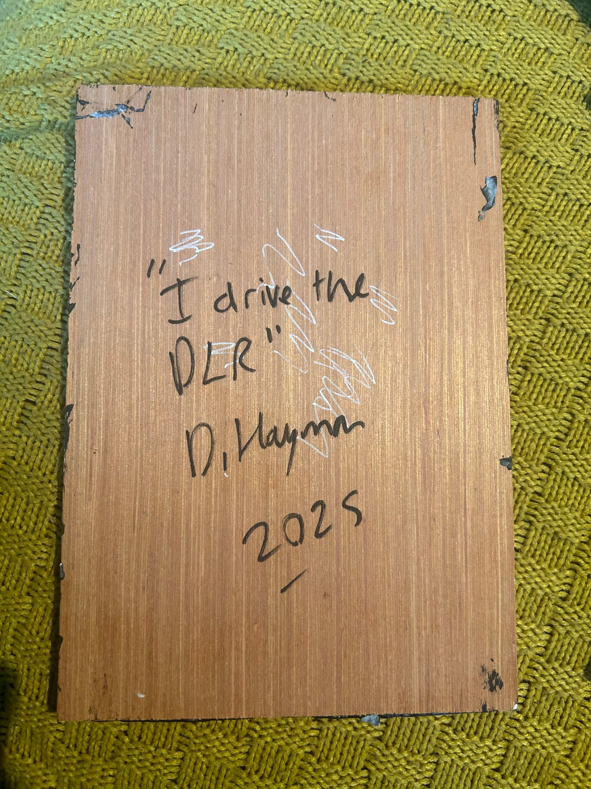‘I Drive the DLR’ A5 night painting. Acrylic on board. Framed. 2025