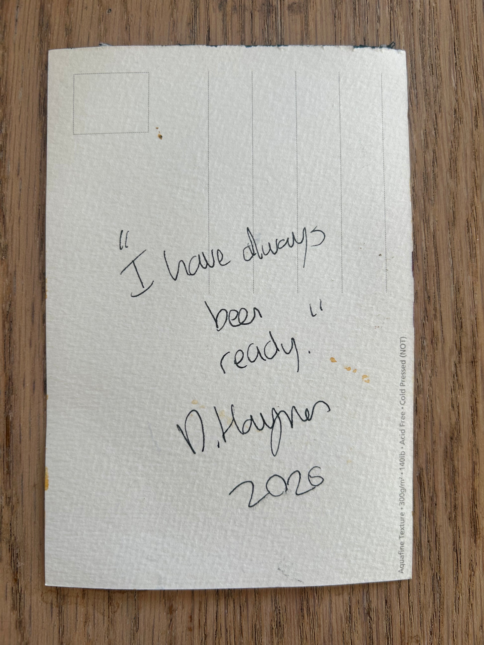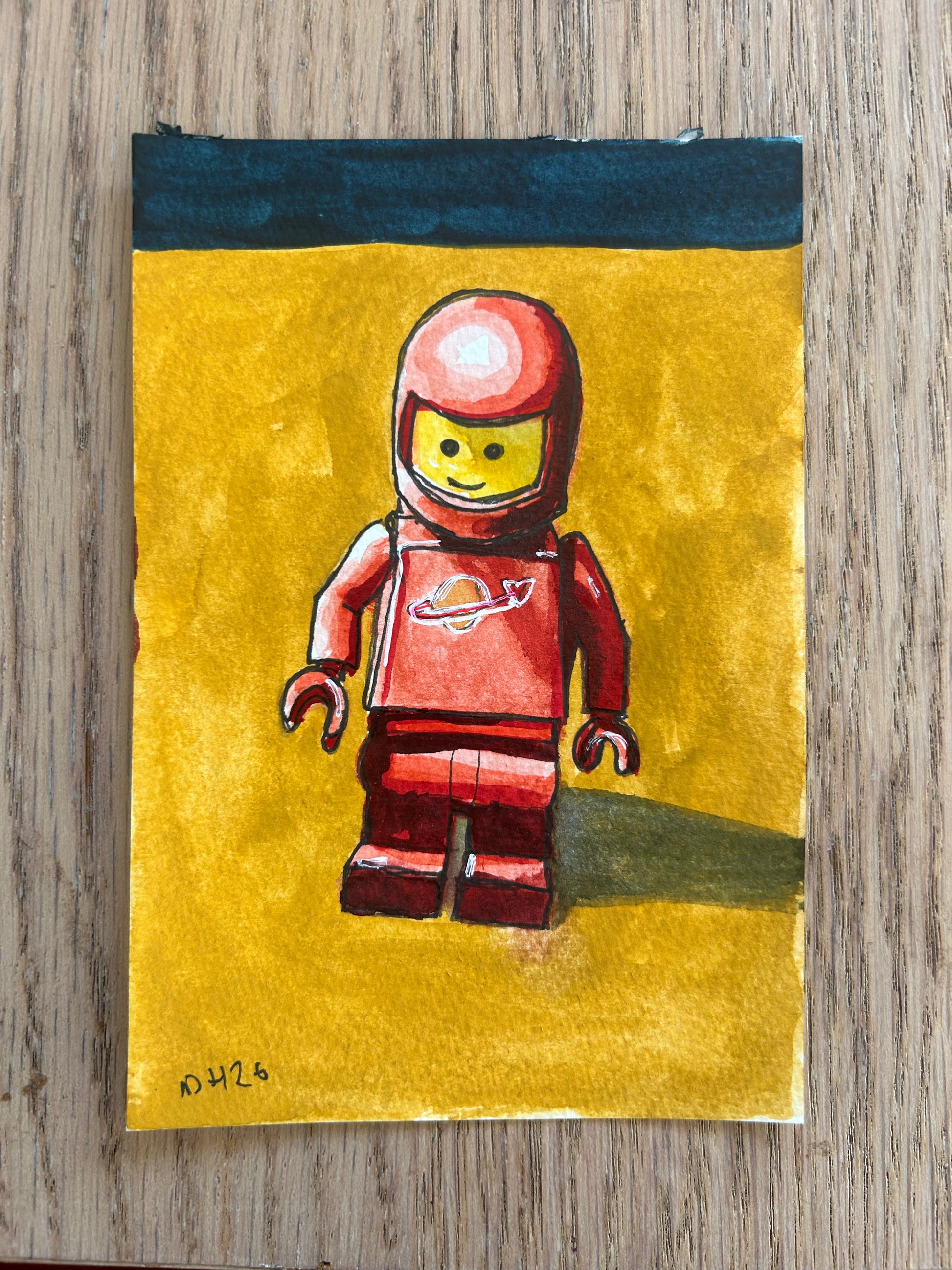 ‘I Have Always Been Ready’ Postcard painting of a Lego Spaceman figure 1978.