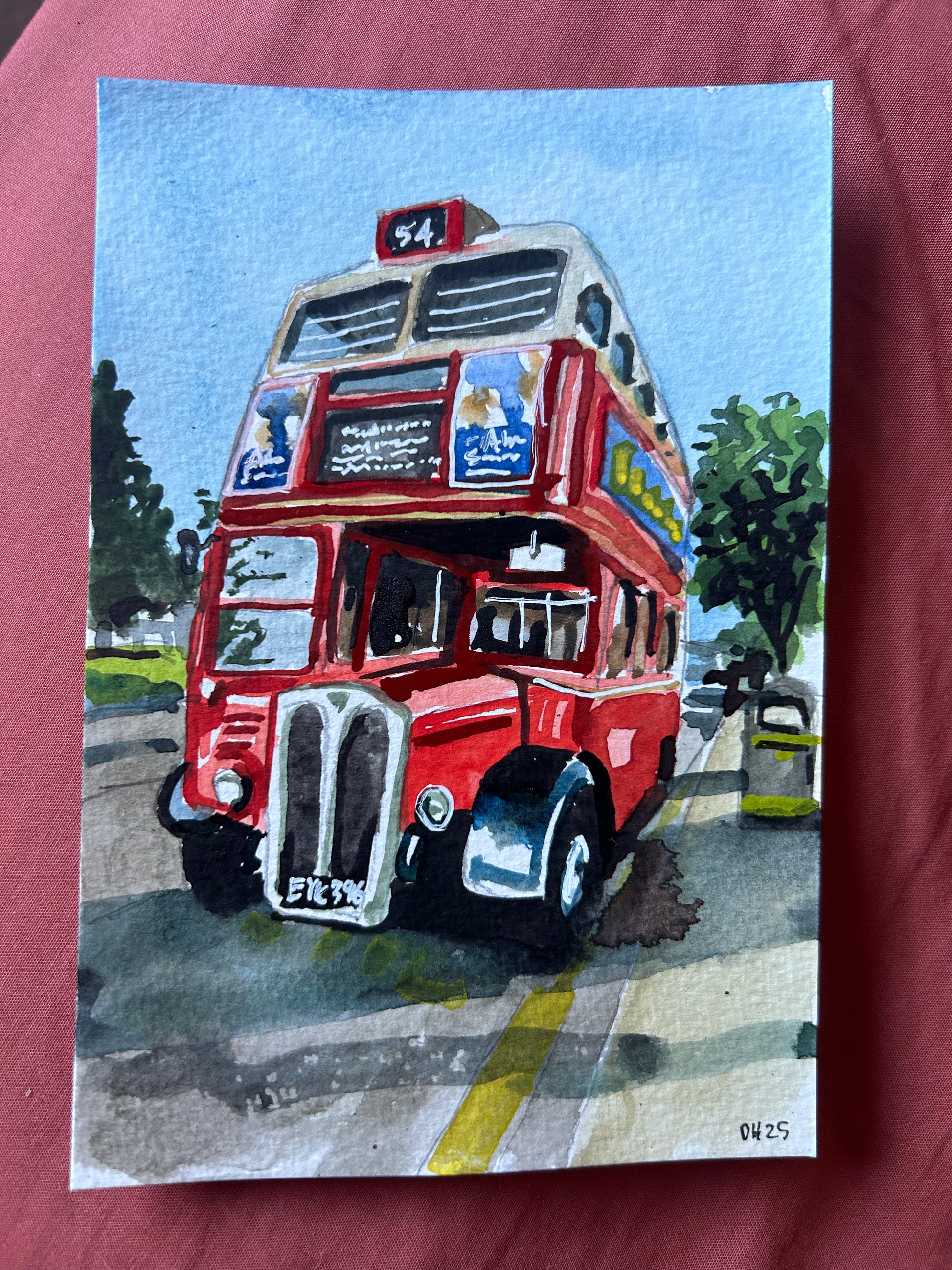 Postcard painting of a London Transport AEC Regent III (RT) type bus