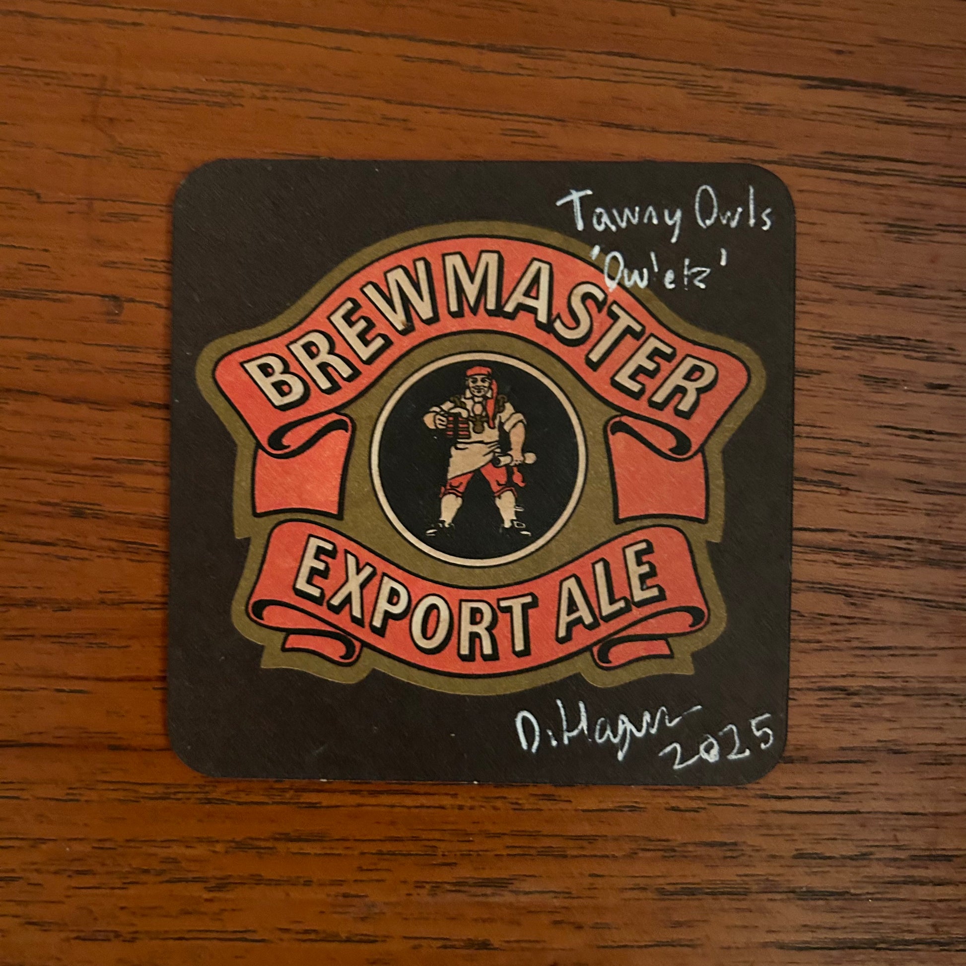 Two Tawny Owlets painted onto a drink/drive Brewmaster Export Ale beer mat from the 1970s. Beermat painting. Watercolour.
